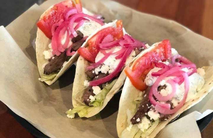 sirloin steak, provolone, grilled onions, lettuce, horsey sauce served on (3) flour tortillas